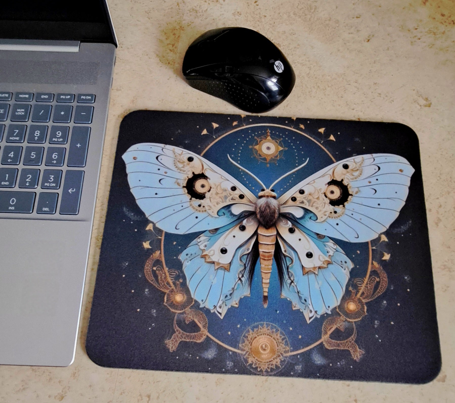 Navigate the digital cosmos with our Celestial Moth Mouse Pad in enchanting blue and gold. This whimsical desk companion features a non-skid rubber backing that keeps your mouse movements as steady as the stars, while the polyester surface offers smooth sailing through your digital adventures. Let this magical moth guide your cursor through starry nights of productivity and play.