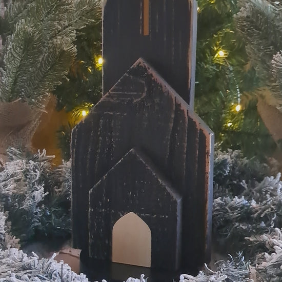 Bring rustic charm and holiday warmth to your home with this enchanting cottagecore painted in charcoal, church. Handcrafted from reclaimed pine wood, each piece showcases hand weathering and character that tells a story of timeless tradition. The bronze cross embellishment adds an elegant spiritual touch, making it a meaningful seasonal decoration or year-round keepsake. Perfect for displaying on mantels, shelves, or as a centerpiece, this charming church captures the cozy, nostalgic spirit of a countryside Christmas. A delightful addition to any farmhouse or cottage-inspired décor collection.