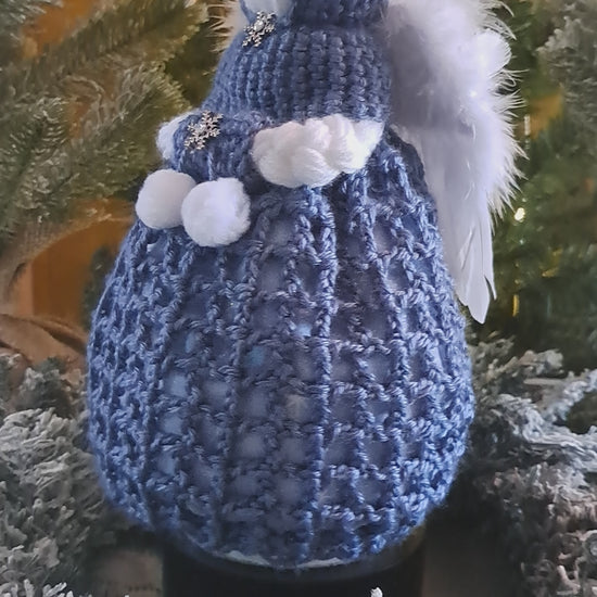 Bring festive charm to your holiday décor with this enchanting Frost Snow Angel. Handcrafted from soft Blue yarn, she features an intricately crocheted dress, cozy shawl, and charming hat, complete with a hand warmer with pom-poms. Her under skirt showcases a delicate blue and white snowflake cotton design. Adorned with shimmering silver snowflakes, this snow beauty comes with a matching crocheted ornament, making her perfect for Christmas. A magical addition to your seasonal collection that celebrates the wonder of winter.