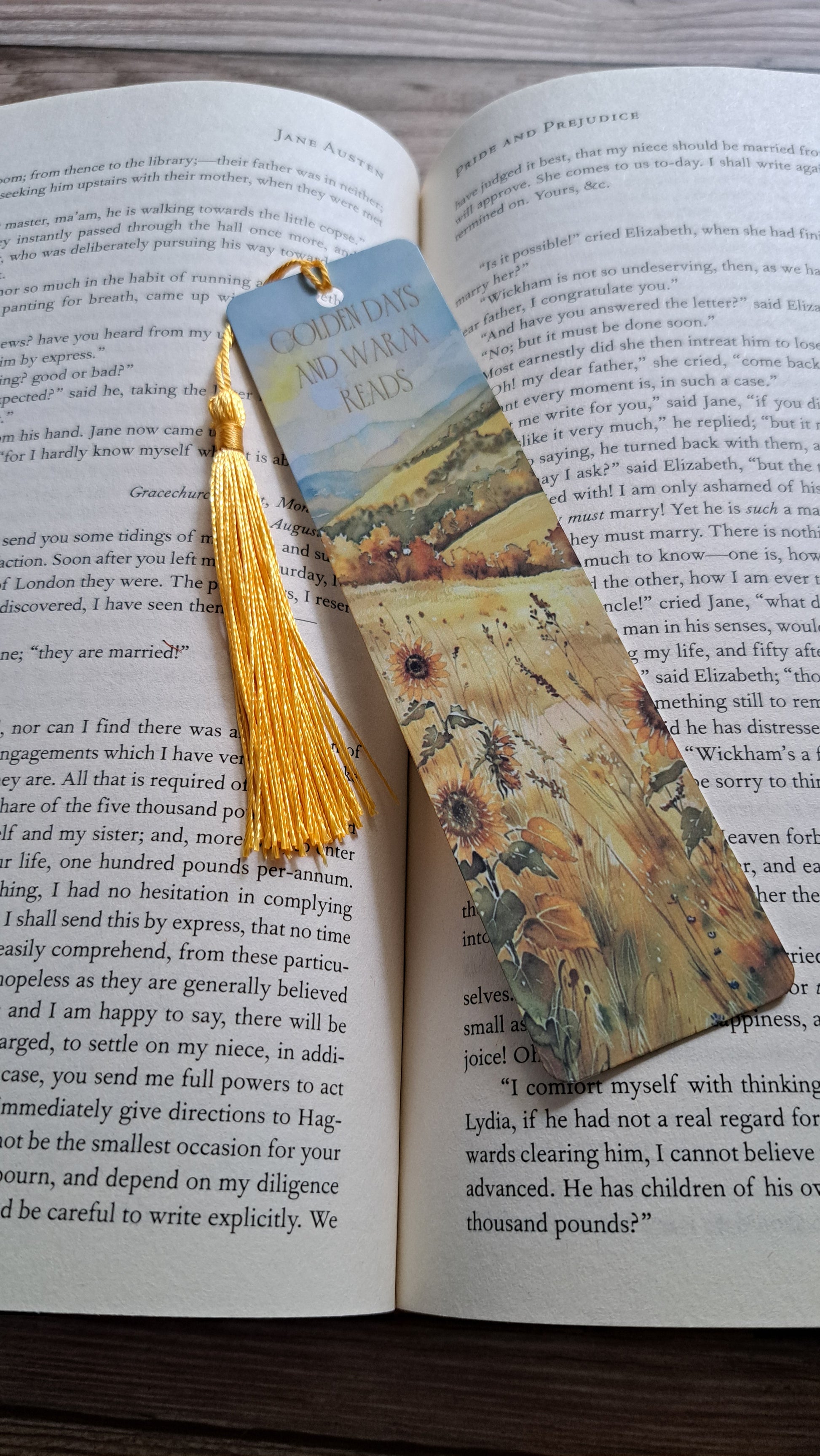 Brighten your reading moments with this playful sublimated metal bookmark, showcasing rolling hills, cheerful sunflowers, and the uplifting phrase "golden days and warm reads." Topped with a golden rod tassel, it adds a sunny touch to every page you mark.
