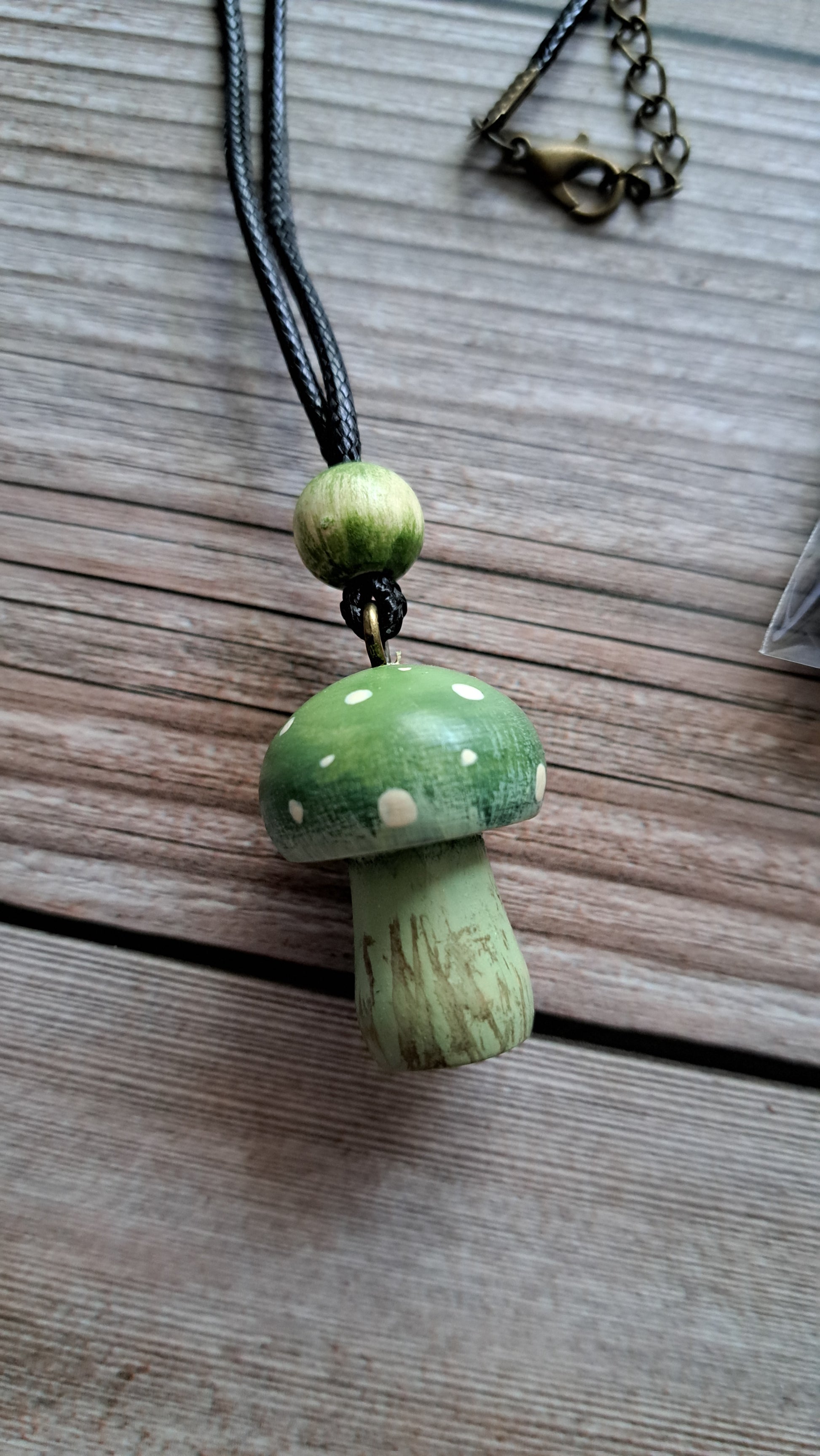 Bring a touch of magic to your outfit with this whimsical hand-painted wooden mushroom necklace. Delicately crafted in mossy greens, browns and creams, it hangs gracefully from a soft faux leather cord, making it the perfect playful accessory for nature lovers and dreamers alike. Perfect for all your autumnal fashions.
