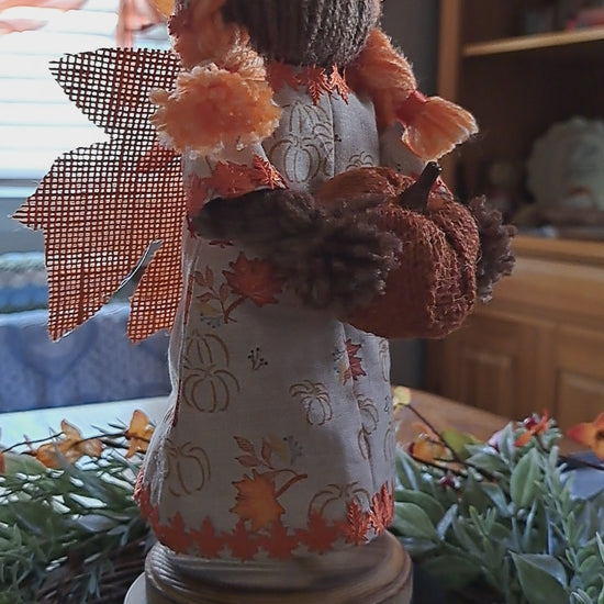 Meet Marigold, the Pumpkin Autumn Fairy, a handcrafted yarn doll that captures the spirit of fall. Dressed in a cozy cotton dress filled with pumpkins and trimmed with vibrant orange maple leaves, she carries a bright orange pumpkin and boasts delicate wings made of orange maple leaves and pinecones. Marigold embodies every shade of autumn orange, bringing warmth and charm to your seasonal decor.