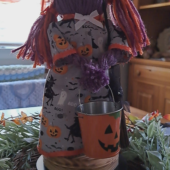 Ruby the Trickster Treater Figure is a charming handmade yarn doll full of Halloween spirit. With her askew ponytails, slightly wonky witch hat, and an enthusiastic stack of bows, Ruby proudly holds her mother’s oversized broom. She’s ready to wander the neighborhood, pumpkin bucket in hand, for a night of playful tricks and tasty treats. And she did it all by herself! Perfect for adding a dash of whimsy and fun to your Halloween decorations!
