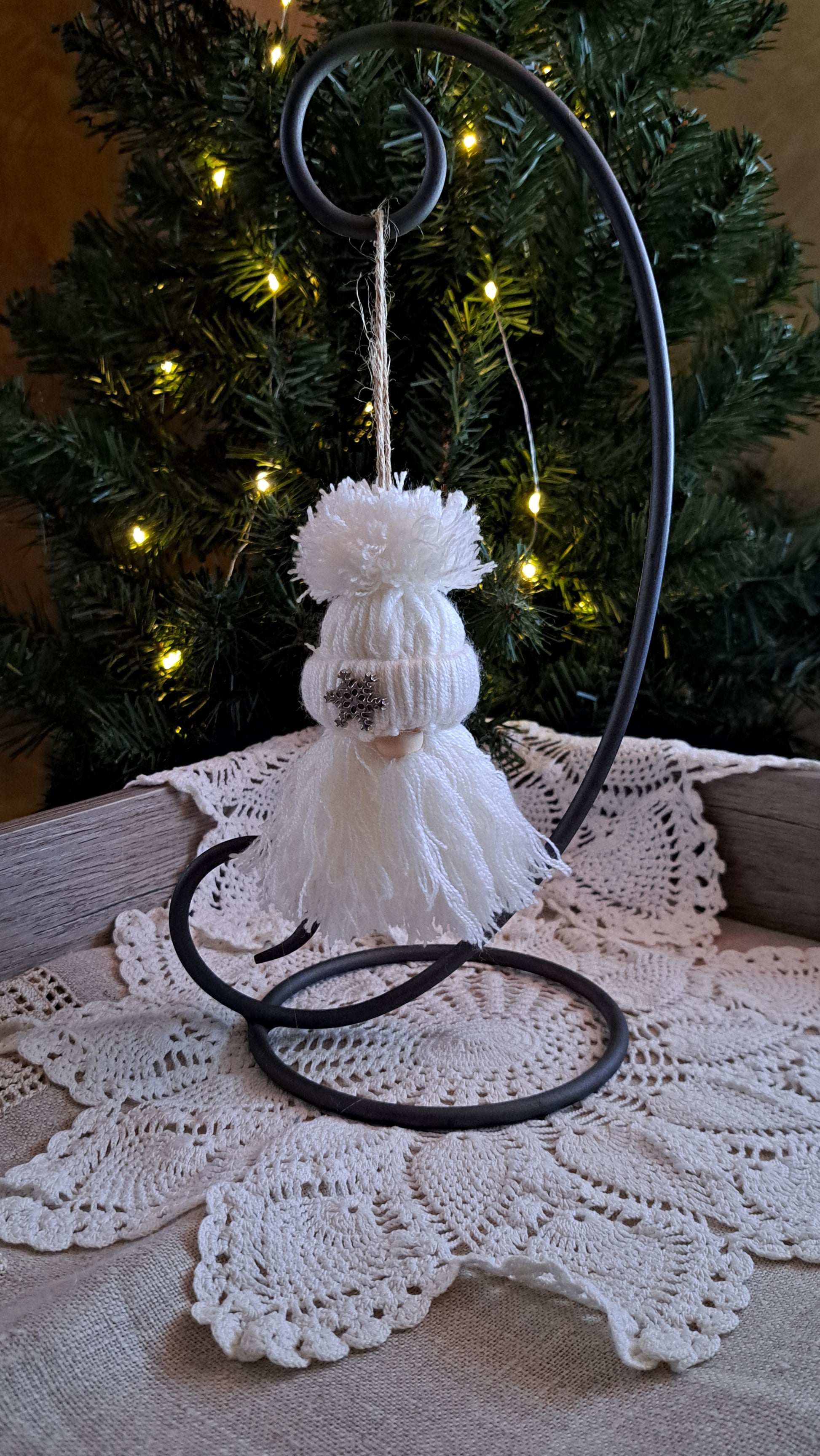 Meet your new holiday treasure—a charming handmade gnome ornament crafted from soft, creamy white yarn. This whimsical character sports a cozy winter pom pom hat with silver snowflake perfect for festive décor and features an adorable wooden nose for authentic character. Each piece is lovingly made by hand, making it a unique addition to your Christmas tree or seasonal display. Ideal for spreading holiday cheer throughout your home.