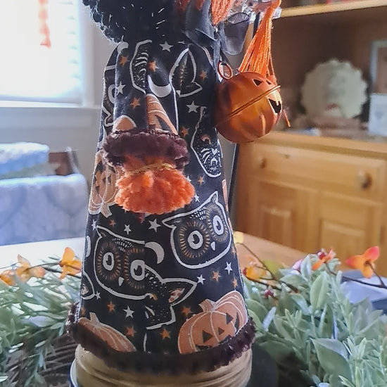 Embrace the eerie charm of the Pumpkin Queen Figure, a handmade yarn doll cloaked in a black cotton gown adorned with pumpkins, owls, and black cats. Trimmed with dark brown fur, she wears her jack-o-lantern bell necklace with haunting grace. Her golden crown rests in raven-black hair streaked with silver fairy highlights, while her staff of pumpkin and crystals leads you deeper into her shadowy pumpkin patch. A perfect touch of spooky magic for your autumn décor.