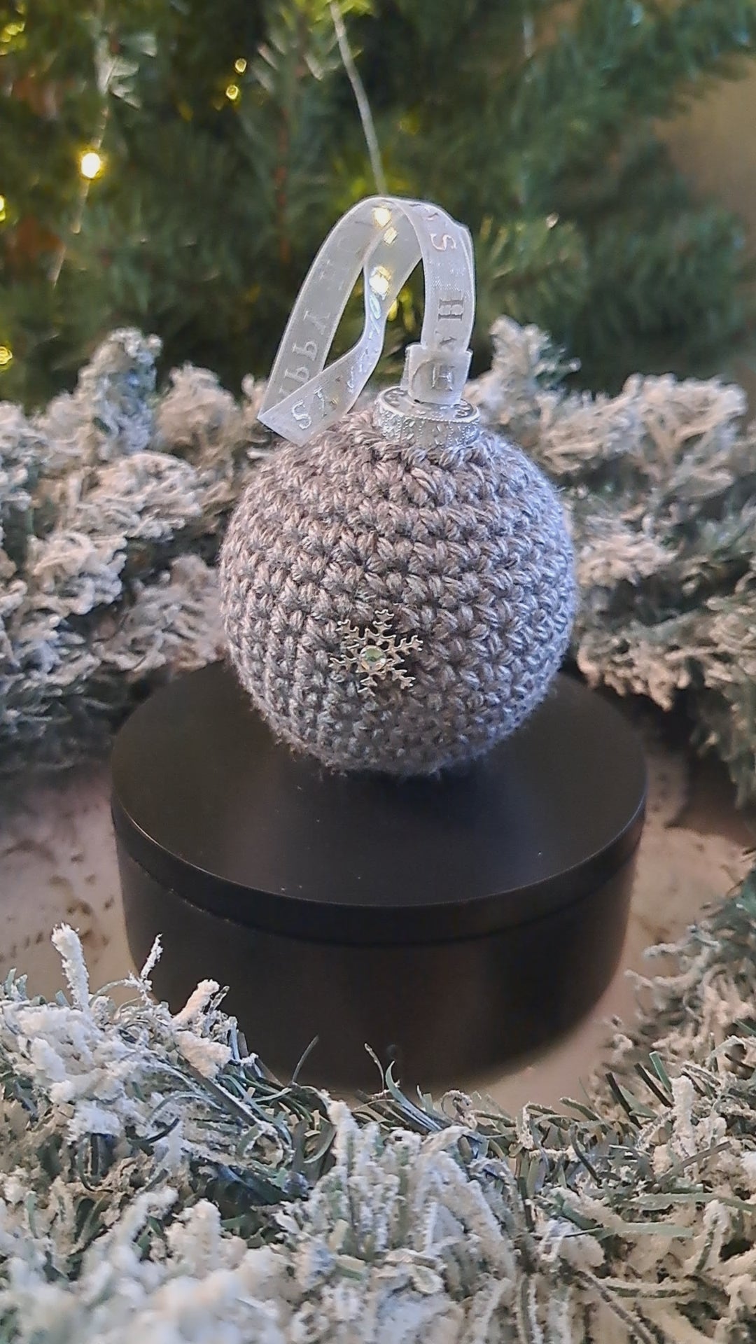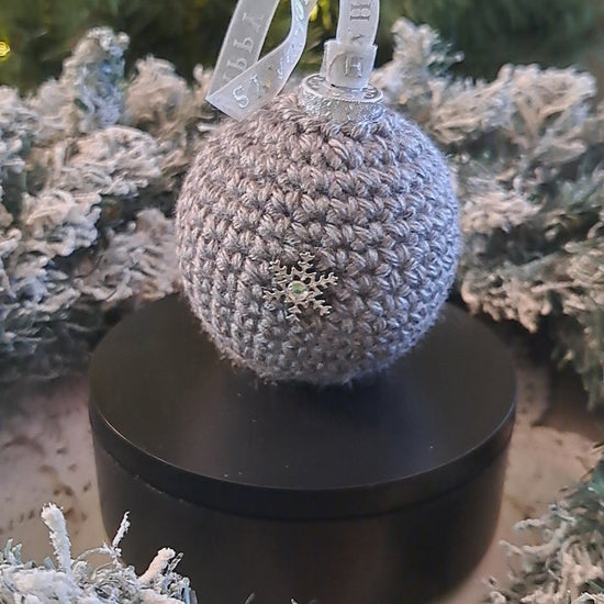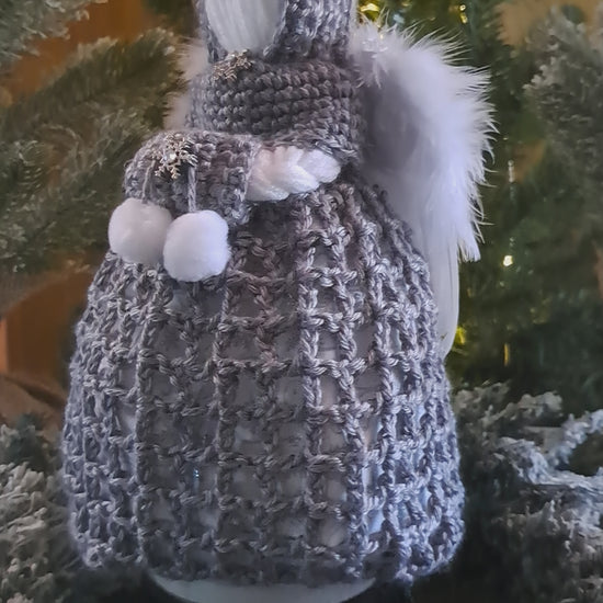 Bring festive charm to your holiday décor with this enchanting Tinsel Snow Angel. Handcrafted from soft yarn, she features an intricately crocheted dress, cozy shawl, and charming hat, complete with a hand warmer with pom-poms. Her under skirt showcases a delicate white and gray snowflake cotton design. Adorned with shimmering silver snowflakes, this snow beauty comes with a matching crocheted ornament, making her perfect for Christmas. A magical addition to your seasonal collection that celebrates the wonder of winter.